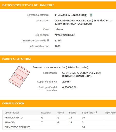 BENICARLO. C/ SEVERO OCHOA Nº 20. SE VENDE PARKING de 10 m2 con TRASTERO de 3 m2 . Se vende en total 3 parking con trastero.El acceso del vehículo se realiza mediante ascensor. Construido el año 2006.